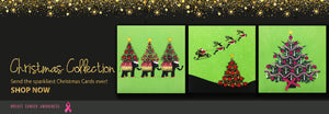 Each card is hand-painted with rich dimensional paint, lashings of hand-applied glitter and accessorised with sequins, rhinestones, stars and/or bows in our beautiful bright studio.