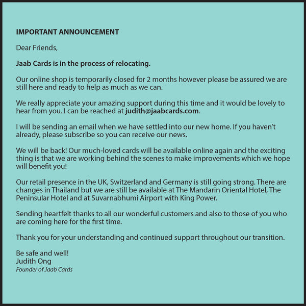 Jaab Cards was founded in 2004 and we have stockists in Thailand, Switzerland, Germany, Italy, Great Britain, USA, Singapore and Japan.